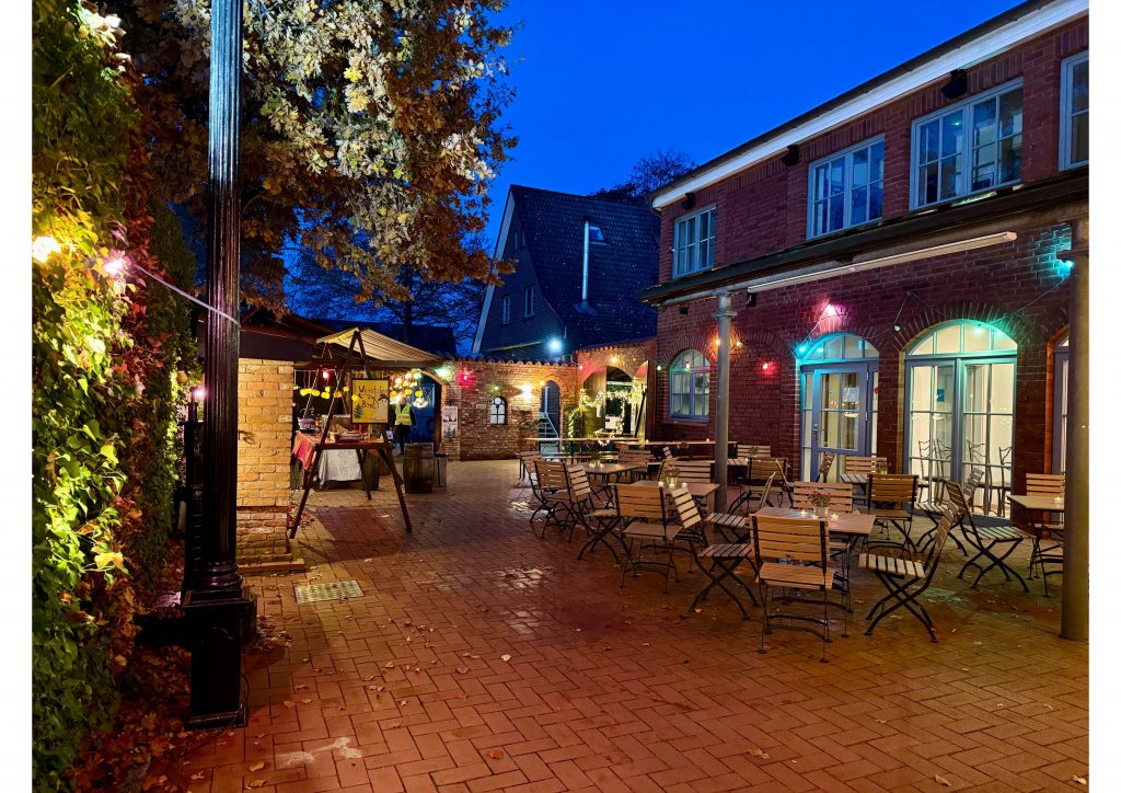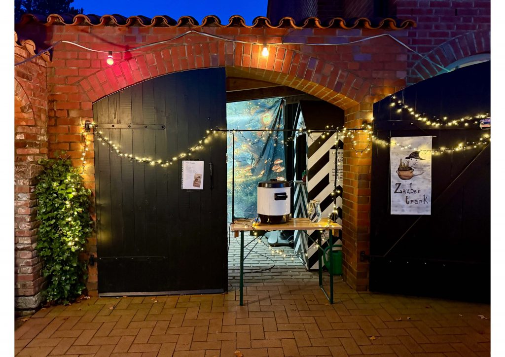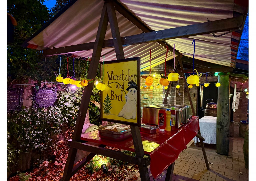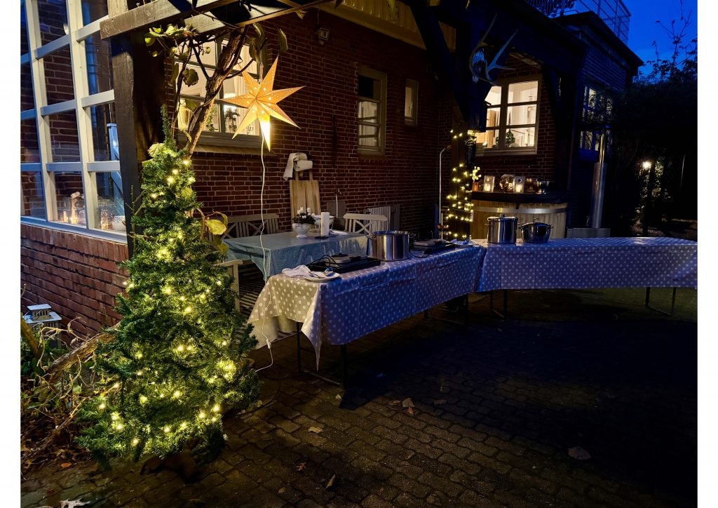 Im wunderschön geschmückten und beleuchtetem Innenhof der Dittchenbühne haben wir mehrere kleine Marktstände aufgebaut, an denen Essen und Trinken ausgegeben wurde. So ist eine kleine Weihnachtsmartatmosphäre entstanden.